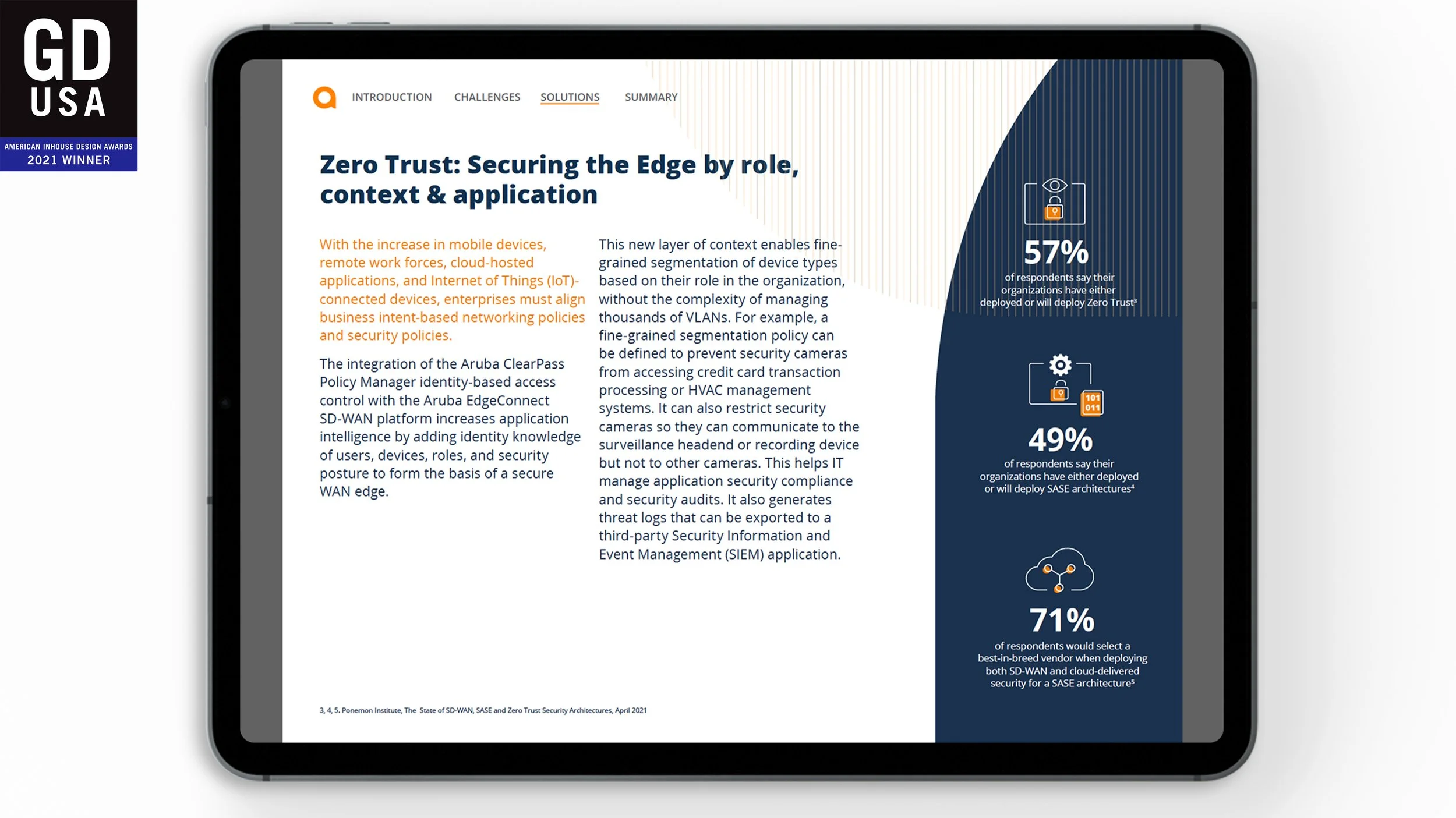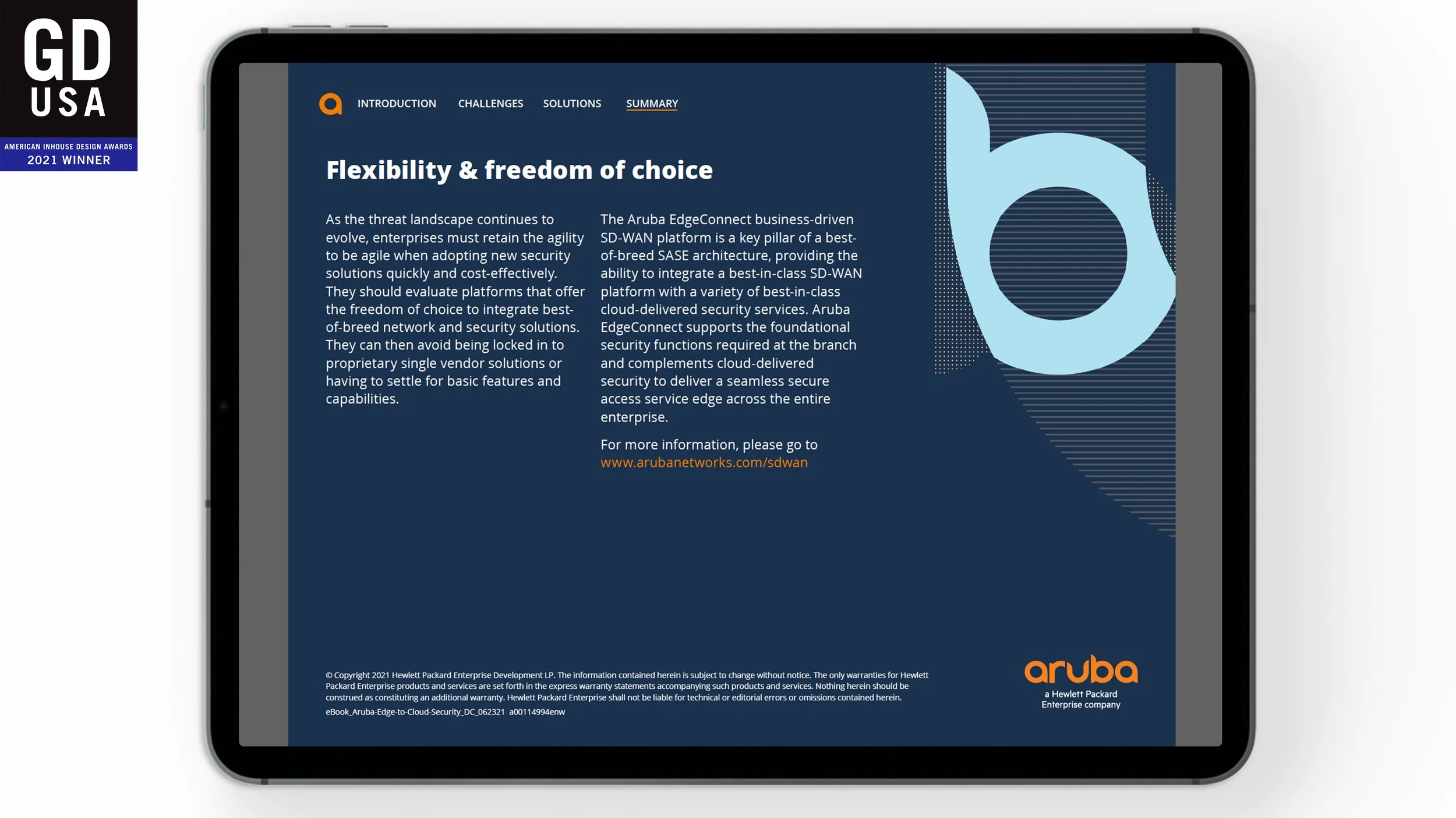 Aruba leverages eBooks and infographics as sales and marketing tools to showcase its solutions and technology. The Edge-to-Cloud Security eBook was recognized with the American Inhouse Design Award by GDUSA in the Brochure & Collateral category.