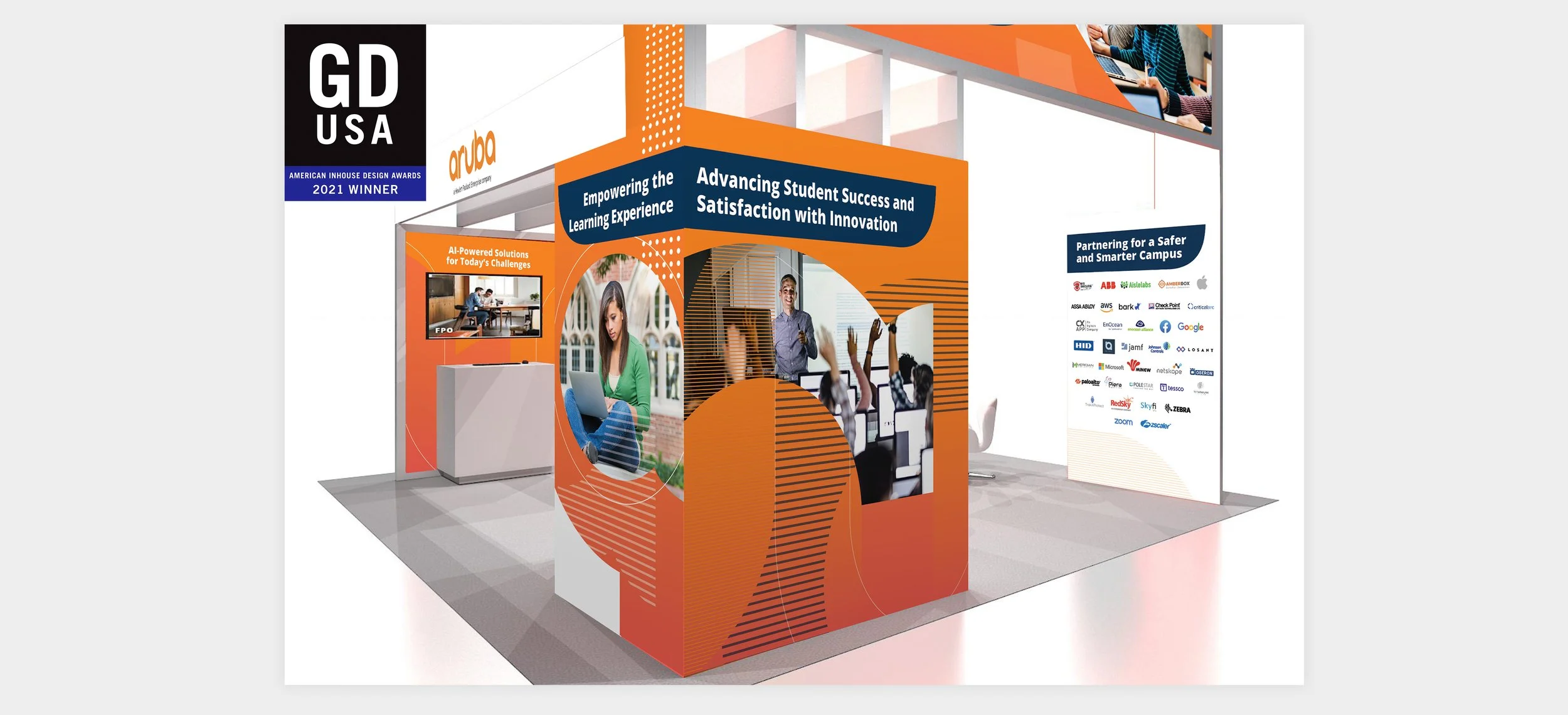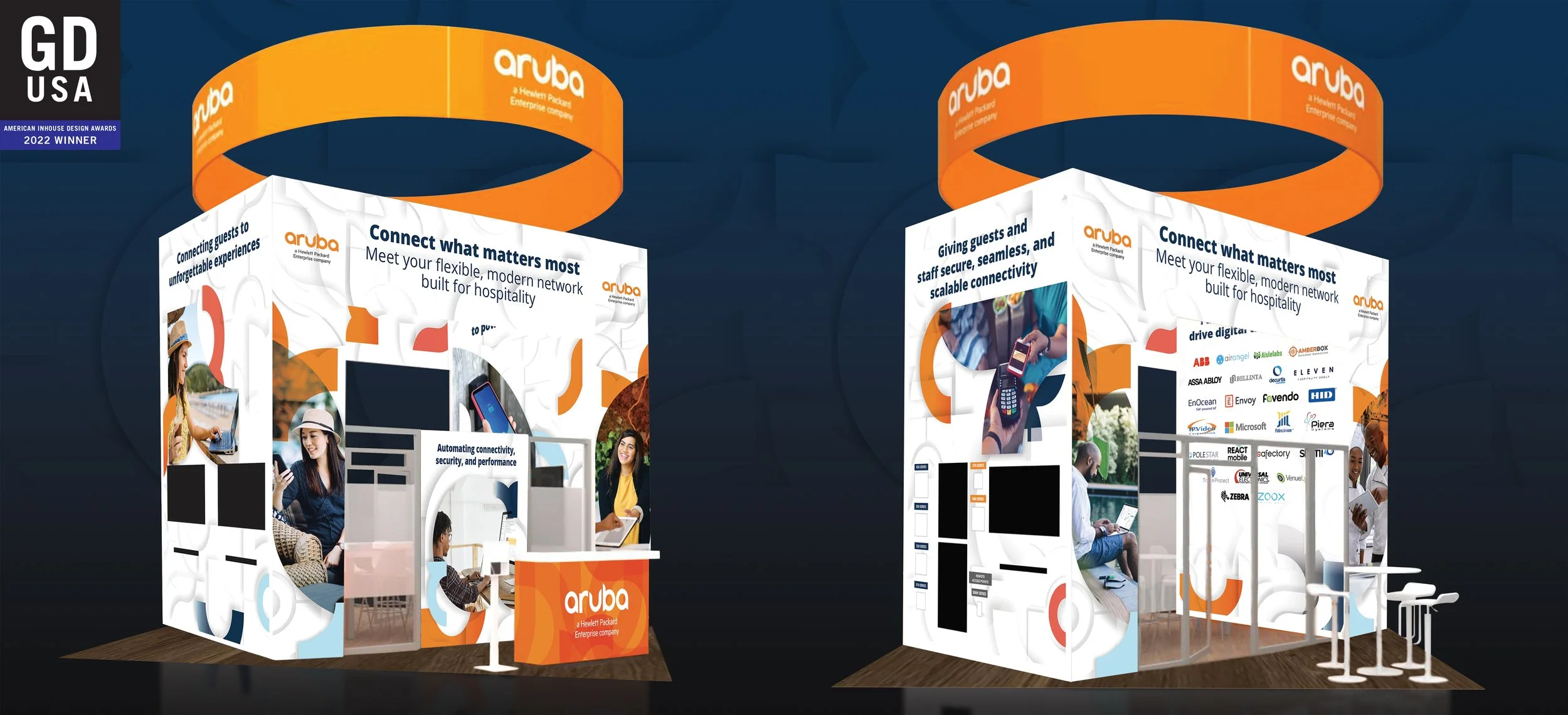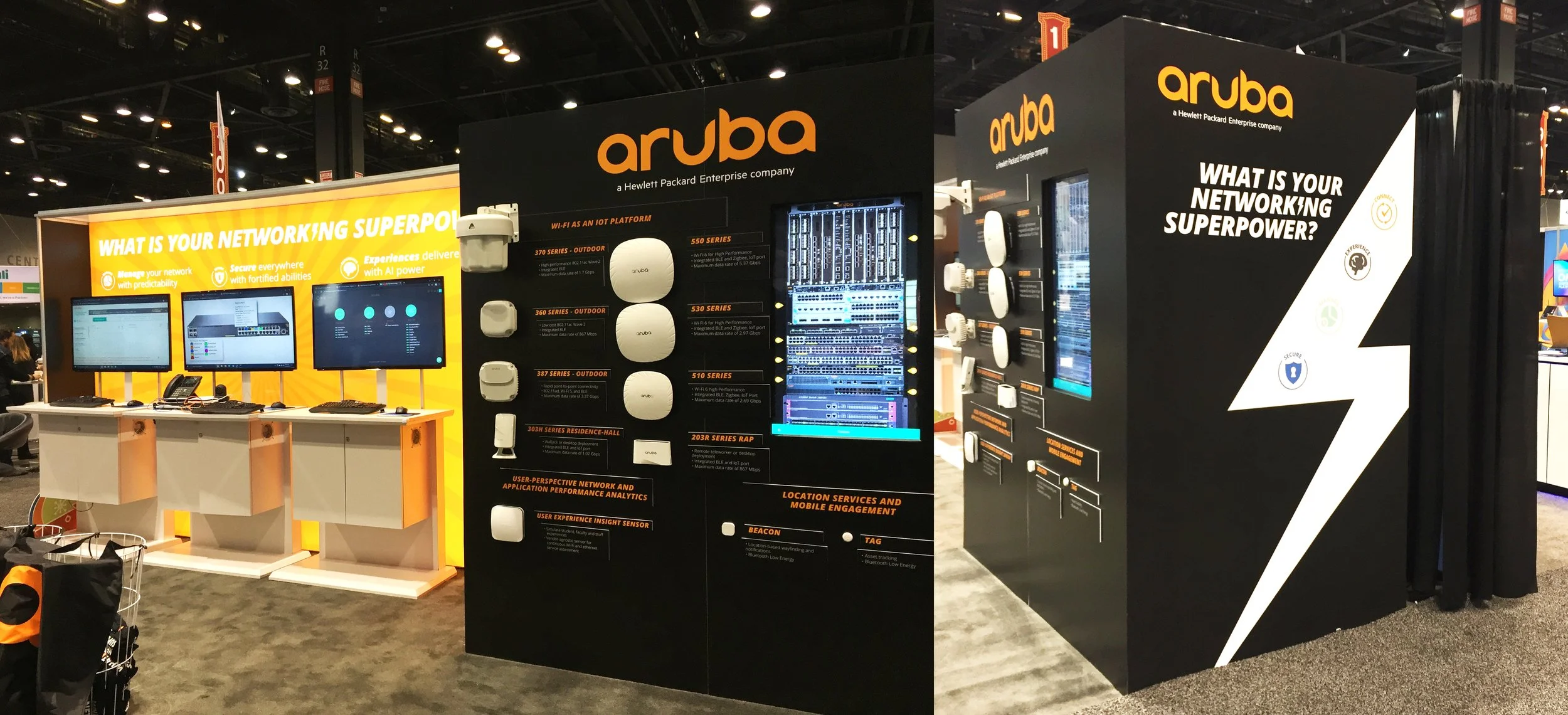 These are examples of environmental graphics I designed for Aruba's vertical events and office space. In collaboration with the product marketing, content, and event teams, I created physical experiences that elevated Aruba's brand presence and enhanced customer interaction within these environments.